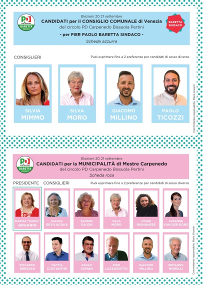 Per queste motivazioni e forte delle mie esperienze personali ho rinnovato la mia disponibilità a candidarmi e chiedo il tuo sostegno e quello delle persone a te vicine, scrivendo sulla scheda rosa, per la Municipalità di Mestre Carpenedo, il mio cognome e quello di Simona Sannicolò che è un'amica con la quale ho condiviso questo percorso e con la quale vorrei continuare a collaborare. Ricordandoti perciò la possibilità di esprimere due preferenze, purché siano un uomo ed una donna