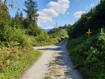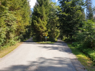 Andando sempre dritti e superando il centro del paese. Passiamo altri campi fino al secondo paesino Jadendorf. In questo paese, nel centro, le indicazioni ci porterebbero a seguire la strada che gira sulla destra e che ci porterebbe sulla statale, invece noi prima di curvare prendiamo la strada sulla sinistra che sale verso la fine del paese e successivamente altri campi. Poco dopo la strada non è più asflatata e ridiventa sterrata. Procidiamo su questa strada per quasi 3 km in mezzo al bosco fino ad un bivio.