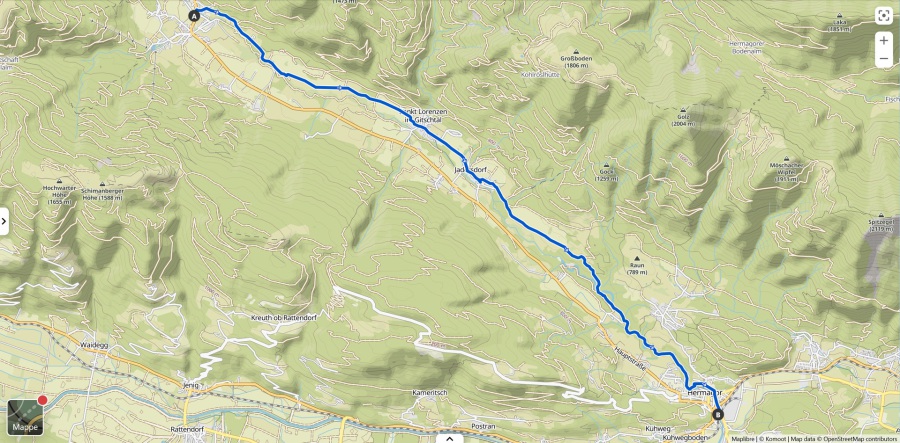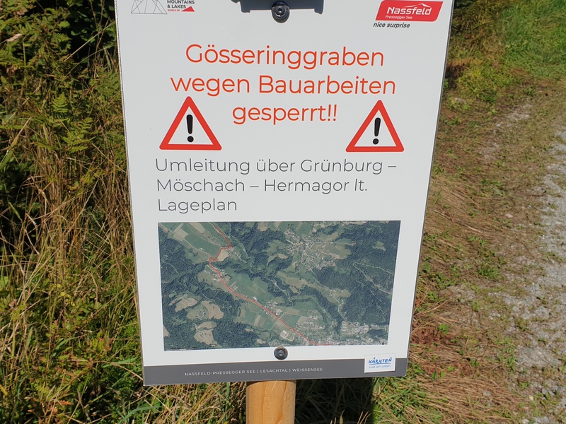 Ad oggi (2022) ho trovato la strada sbarrata per lavori e non sarebbe percorribile, l'avevo fatta qualche anno fa e il percorso era aperto, io l'ho fatta in giorno festivo e quindi sono riuscito a passare lo stesso. Se siete in giornata lavorativa vi consiglio di andare dritti e collegarvi alla statale dopo pochi km sarete ad Hermagor. Se invece avete la possibilità prendete la strada sulla sinistra che percorre la gola del fiume Gössering che merita di essere percorsa per la sua bellezza. Finita la gola vi troverete alla fine della cittadina di Hermagor, potete scendere e percorrere la Hauptstrasse che vi porta in centro e visitarla. In questo tour ho preferito evitare il centro ed effettuare una variazione fino ai parcheggi dei supermercati dove è comodo parcheggiare.