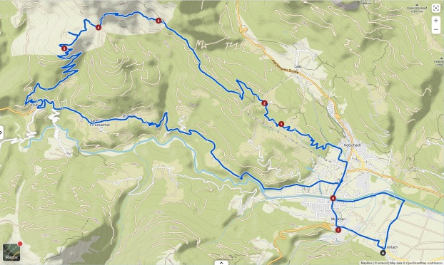 Partiamo dal paesino di Würmlach comune di Kötschach in Carinzia a quota di poco meno di 700mt. Affrontiamo il percorso ciclabile codificato dall'amministrazione KM3 e arrivati ai capitelli Röttenkopf continuiamo dritti in salita percorrendo una strada privata (ATTENZIONE!!! la strada è privata e quindi si percorre a proprio rischio e pericolo!!) Il percorso si sviluppa per quasi 35km (14,5km in ascesa e 19.5km in discesa). L'altezza massima raggiunta è di 1562mt, dura circa tre ore per un dislivello di circa 700mt classificato di difficoltà media, colore rossa (come le piste da sci!!). Il tour si sviluppa in maniera circolare sopra la collina a Kötschach fino ad arrivare al punto più interno ed alto, la mulattiera per Auf der Mussen. Poi si scende lato Lesachtal tra strade forestali, boschi, paesaggi mozzafiato e la statale della valle. Prestare attenzione per le strade asfaltate perchè sono percorse da automobili.