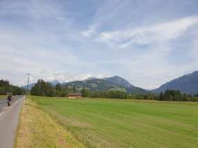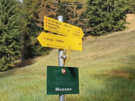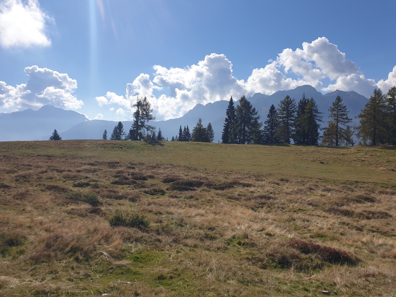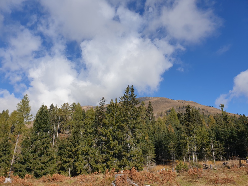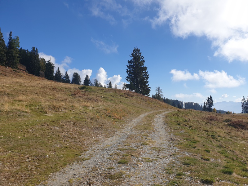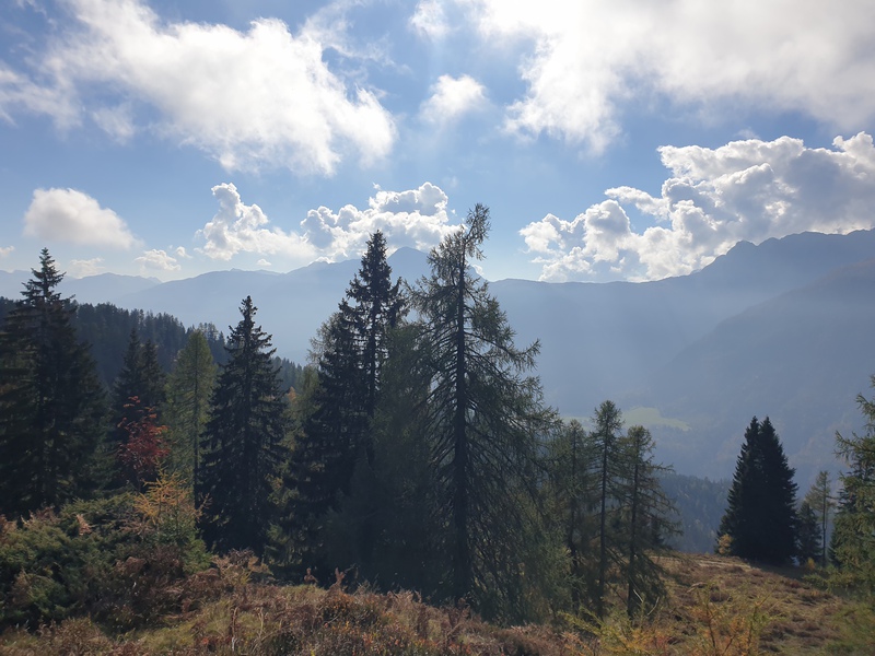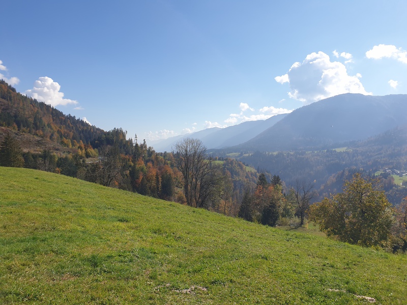 Incontriamo un bivio a destra si salirà ai Mussen, a sinistra si scenderà verso i prati di Lumweisen. Dopo pochi metri ci arriviamo. Questi prati ci regalano un panorama spettacolare sulla valle della Gail e sulla Lesachtal. Scendiamo lungo una strada forestale assloata con pendenza del 8/10% fino alla frazione di Wurda e di lì la strada ridiventa asfaltata e raggiungiamo la frazione di Podlanig.
