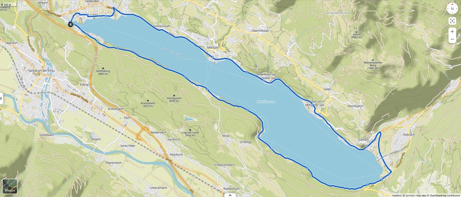 Arrivando da Spital an der Drau o da Gmund sia attraverso la statale che dall'autostrada, incontriamo la prima cittadina adagiata sul lago, Seeboden. Alla prima rotonda dove si affacciano il Lidl e lo Spar prendiamo la prima uscita sulla destra che dopo 500mt ci porterà a un parcheggio e all'inizio del nostro percorso. Il giro è ad anello lungo il lago e ci permette di vedere e ammirare scorci unici. Il lato sud lungo una ciclabile che è una strada forestale in mezzo al bosco. Arrivati dall'altra parte del lago, a Döbriach cittadina balneare, la pista ciclabile diventa asfaltata per poi costeggiare la statale sul lato nord. Se scegliamo il giro classico, passeremo le cittadine che si affacciano sul lago: Dellach, Pesenthein, Millstatt (che da il nome al lago) e Lechenerschaft. Se optiamo per il percorso in quota, incotreremo paesini più rurali.
