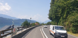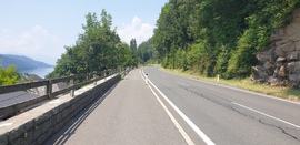 Dopo aver passato i primi stabilimenti balneari ci immettiamo nella statale per circa 300mt fino alla prima strada sulla sinistra dove inizierà la pista ciclabile asfaltata. Pedalando con curiosità attraverso la cittadina ci accorgiamo ad un certo punto che la fine del lago apre le porte ad un'altra valle e i cartelli ci indicano che la R2 continua in quella direzione. Vogliamo fare il giro del lago e quindi proseguiamo dritti.