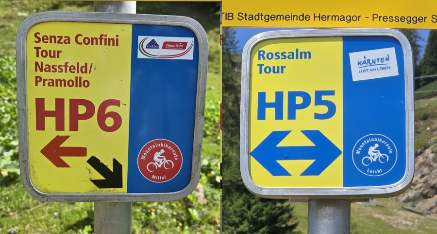 Prendiamo fiato per 500 mt, prima di prendere la strada che sale a sinistra e ci porterà in cima alla sella Nassfeld. Il prossimo km inizia con una pendenza del 13% con molti tratti al 18% e punte al 21%, gli ultimi 400mt risulta più facile con una pendenza del 12% fino alla cime. Prendiamo respiro, ammiriamo il panorama e prepariamoci alla discesa tutta d'un fiato fino al passo Pramollo, prestando attenzione che dopo la Tressdorfer Alm la strada diventa asfaltata e c'è la presenza di molte persone che passeggiano, il trenino e auto che la percorrono per arrivare alla svariate casette del Sonnenalpe.