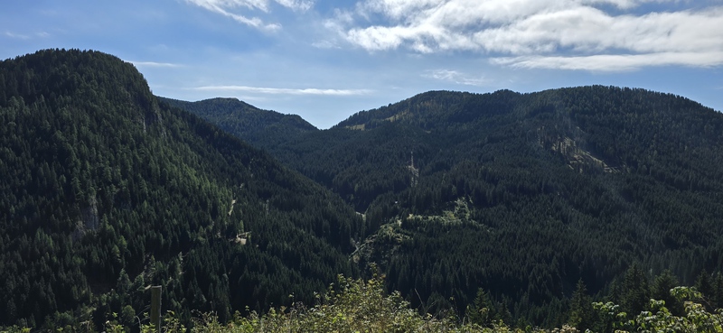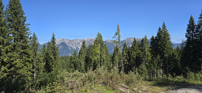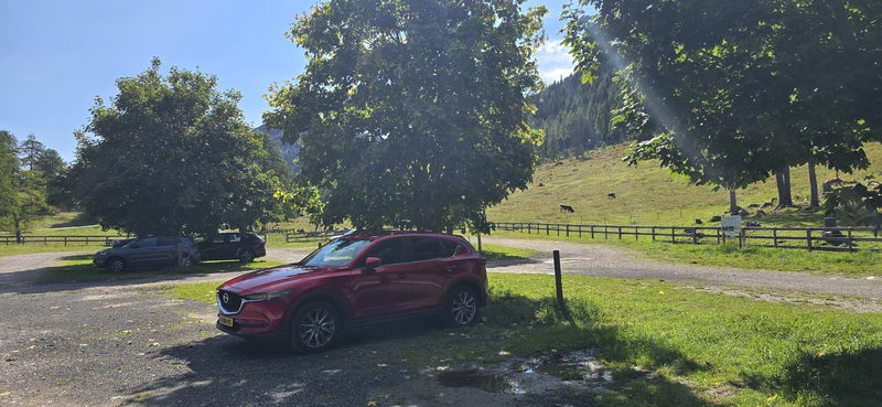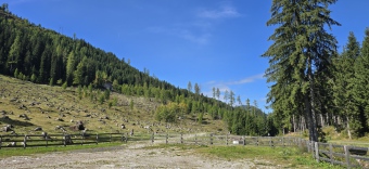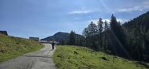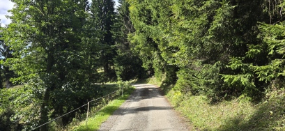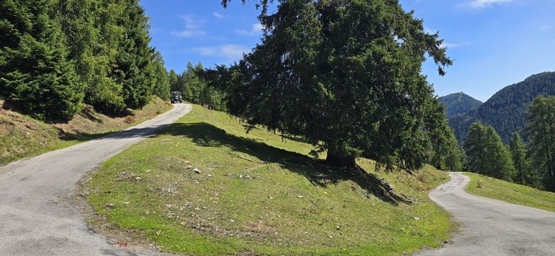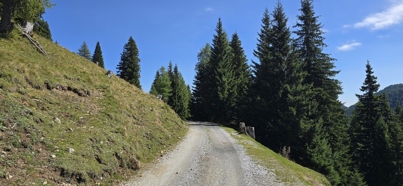 Qualche breve pezzi si immerge nel bosco, ma sono solo poche decina di metri. Dopo pochi chilometri ci sarebbe anche il primo bivio per altre Alm, ma noi ci teniamo sempre sulla destra e continuiamo a salire. La strada dopo che è stata asfaltata cede il passo allo sterrato, che a noi piace di più. Il percorso cinge la montagna che sovrastava il laghetto tra le due Alm e man mano che saliamo ci giriamo intorno fino ad un brusco cambio di direzione che ci riporta indietro.