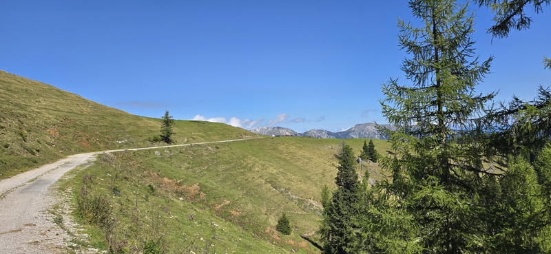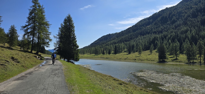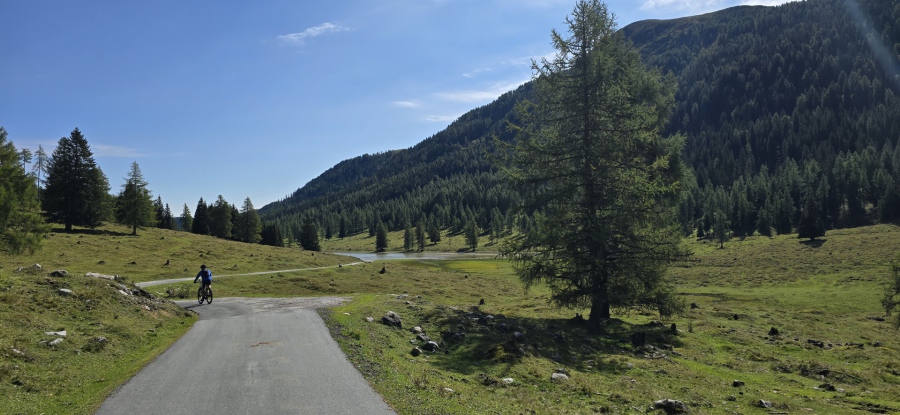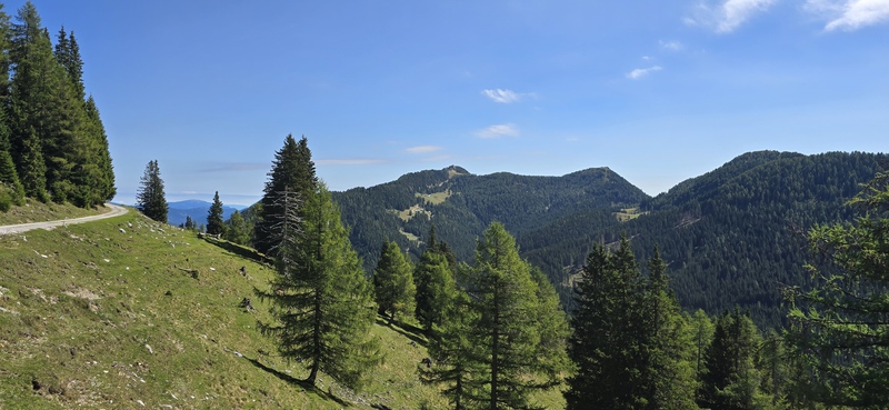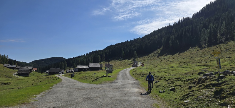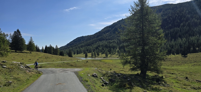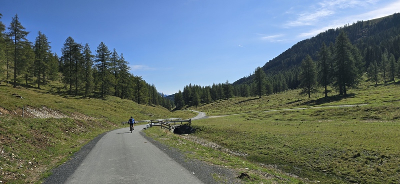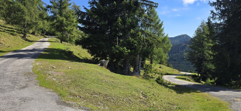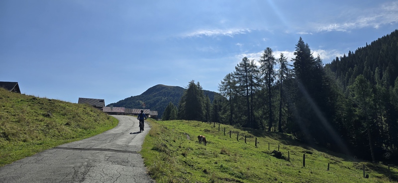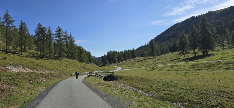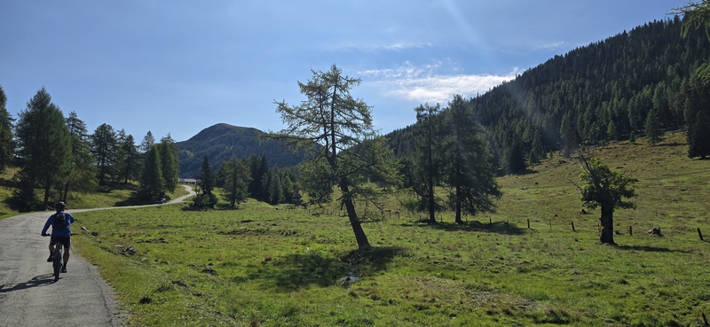 Anche questa seconda parte si risolve facilmente, basta seguire la strada ed andare sempre più in alto. Quello che differenzia dal primo tratto che non ho percorso è che qui gli alberi diradano i panorami si aprono e l'aria diventa più frizzantina regalando gioia ad ogni pedalata. La meta la si conquista faticosamente ma lo sguardo spazia molto di più. Un primo pezzo di tratto è in falsopiano tra le Egger Alm e le Dellacher Alm, da qui si dirama un dedalo di strade e le possibilità sarebbero le più varie per visitare tutti i villaggi che prima ho nominato. Noi ci teniamo sulla destra e, se fino ad ora, abbiamo faticato gran poco, adesso iniziamo a sentire la fatica della salita.