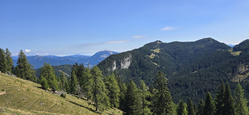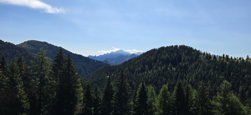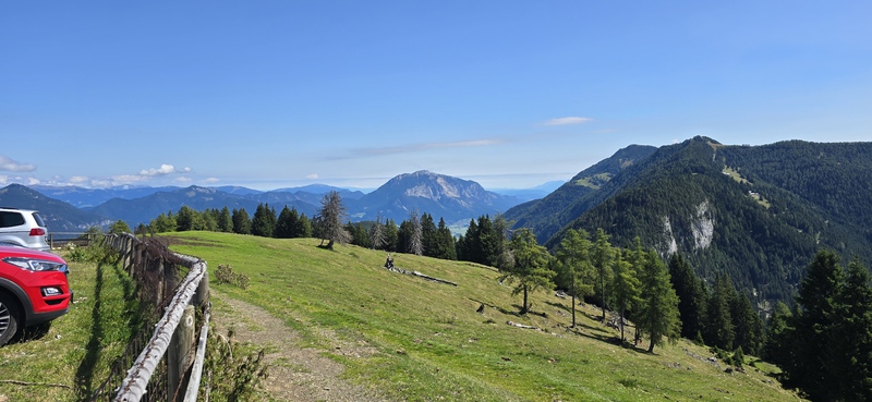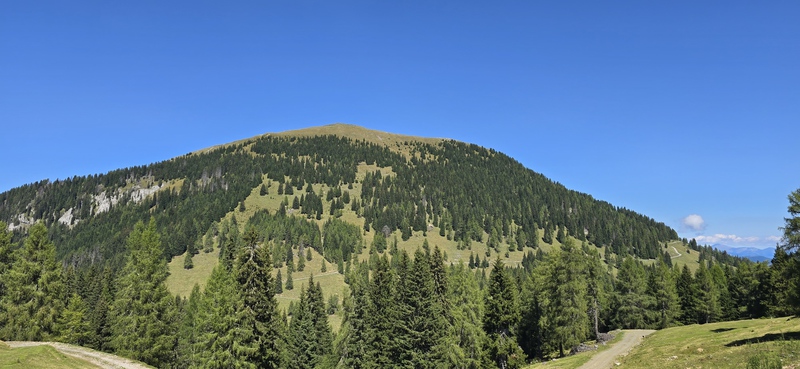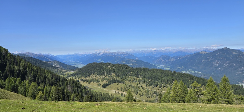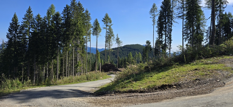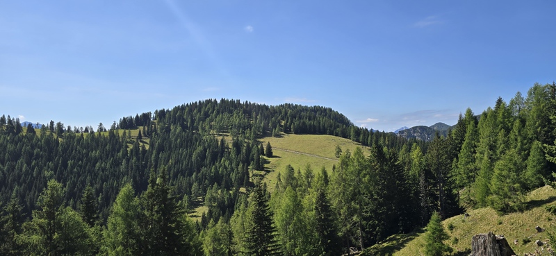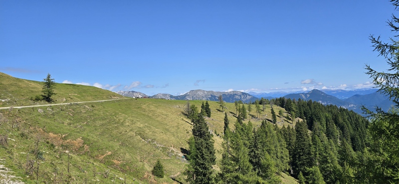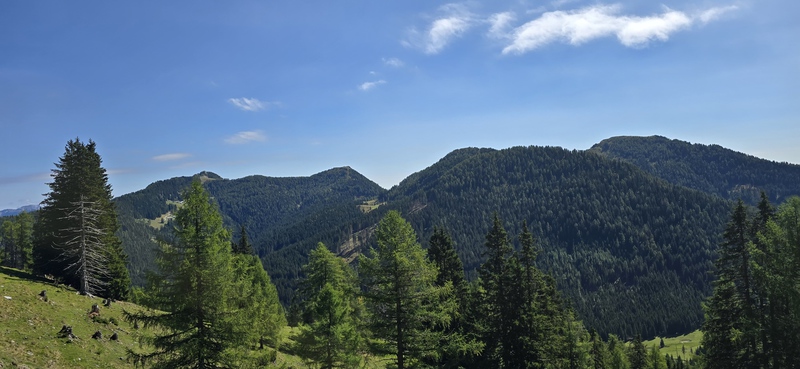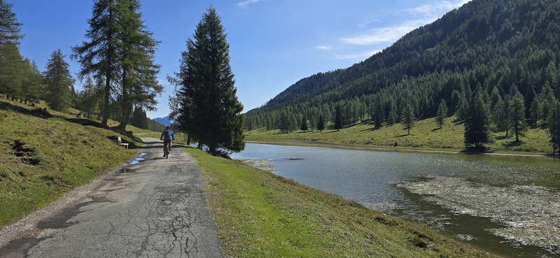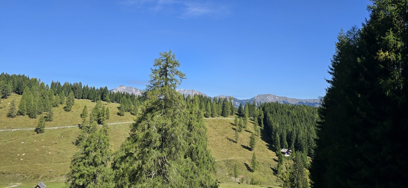 Anche questa seconda parte si risolve facilmente, basta seguire la strada ed andare sempre più in alto. Quello che differenzia dal primo tratto che non ho percorso è che qui gli alberi diradano i panorami si aprono e l'aria diventa più frizzantina regalando gioia ad ogni pedalata. La meta la si conquista faticosamente ma lo sguardo spazia molto di più. Un primo pezzo di tratto è in falsopiano tra le Egger Alm e le Dellacher Alm, da qui si dirama un dedalo di strade e le possibilità sarebbero le più varie per visitare tutti i villaggi che prima ho nominato. Noi ci teniamo sulla destra e, se fino ad ora, abbiamo faticato gran poco, adesso iniziamo a sentire la fatica della salita.