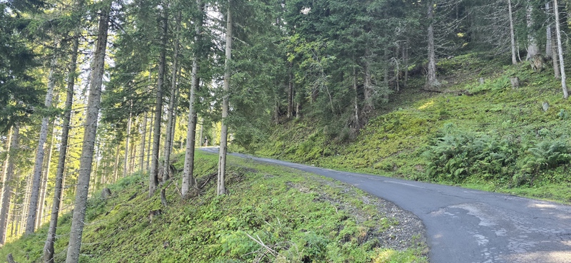 La strada sempre asfaltata al primo tornante, dove c'è l'ingresso alla Gerlitzen Klamm, inizia a salire con decisione. Qui la strada, nonostante l'asfalto e nonostante sia percorsa da automobili si restringe e il fondo diventa in alcuni casi dissestato causa la neve dell'inverno. Ci s'immerge nel bosco e si riemergerà solo poco prima del parcheggio quando si entra nella valletta delle Egger Alm. Questo tratto è lungo altri 12km (da raddoppiare se si pensa di fare a/r) per 810mt di dislivello e 15 tornanti. Non c'è molto da dire se non che è un percorso che solo in alcuni casi svela il panorama circostante e un punto la roccia fa da padrona tanto è che la strada risulta parecchio stretta e con tornanti proibitivi per le auto. Però il piacere della salita e di guadagnare panorami mozzafiato ripaga qualsiasi sforzo, in più effettuare questa ascesa in piena estate potrebbe far apprezzare l'ombra degli alberi.