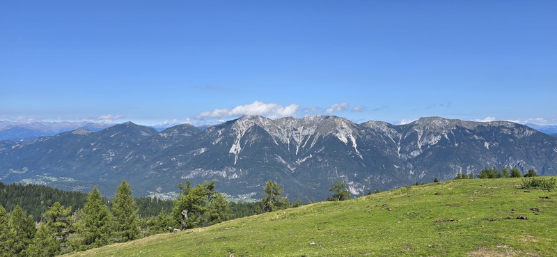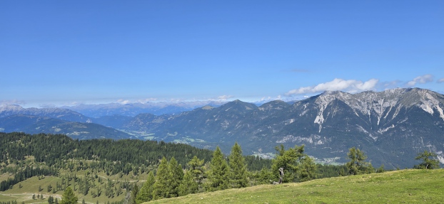 Alla fine arriviamo ad un poggio che ci apre la vista su tutta la valle e non solo, uno spettacolo su tutte le montagne circostanti a nord! Notiamo a sinistra riparate dalla conca della montagna le casette delle Poludniger Alm. Si scende in pochino fino al villaggio e la meta è arrivata. ci riposiamo e ci vestiamo perché il ritorno sarà veloce, ma la discesa divertente.