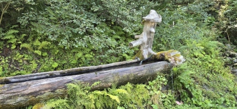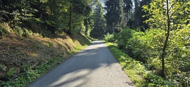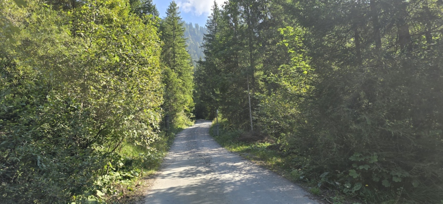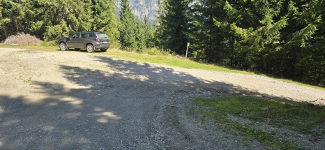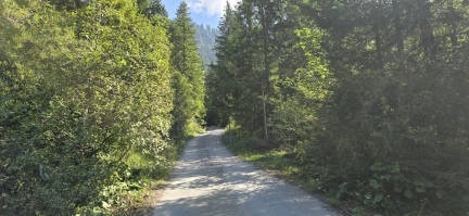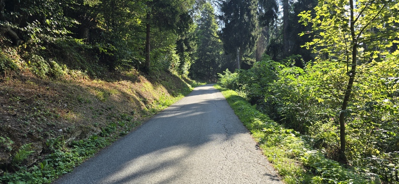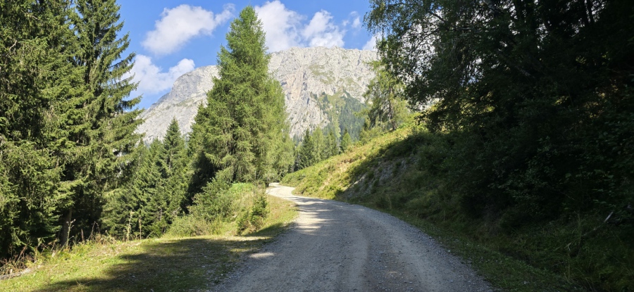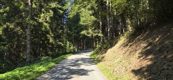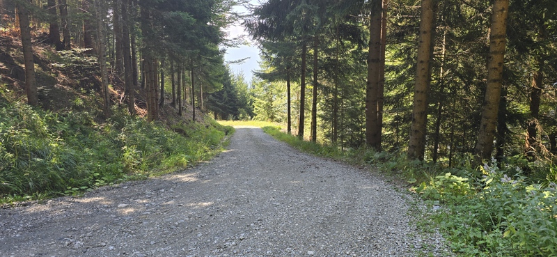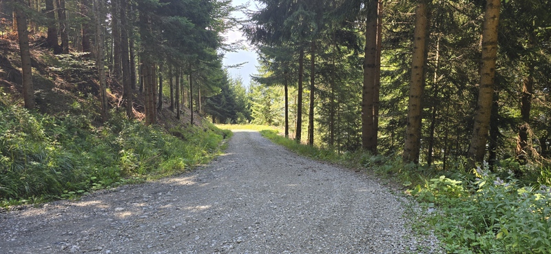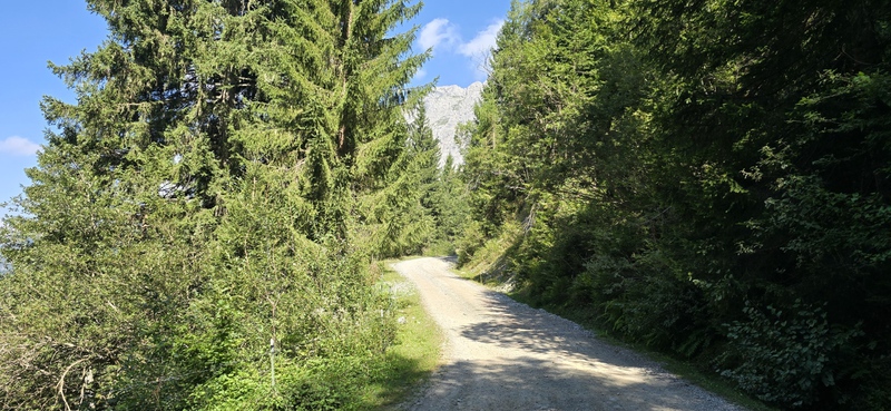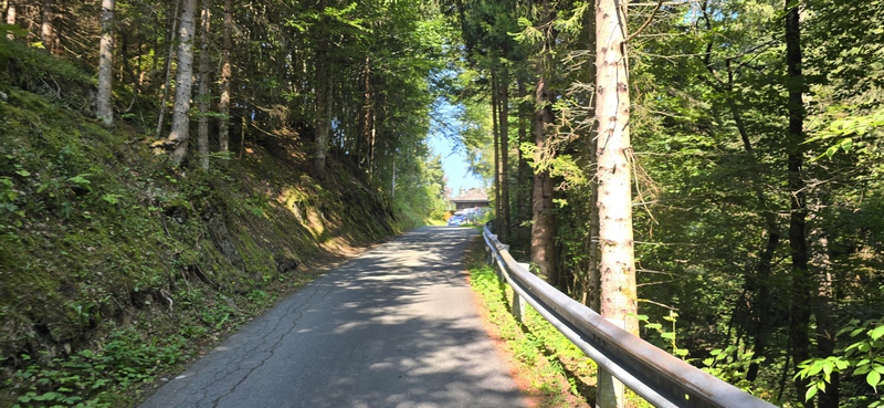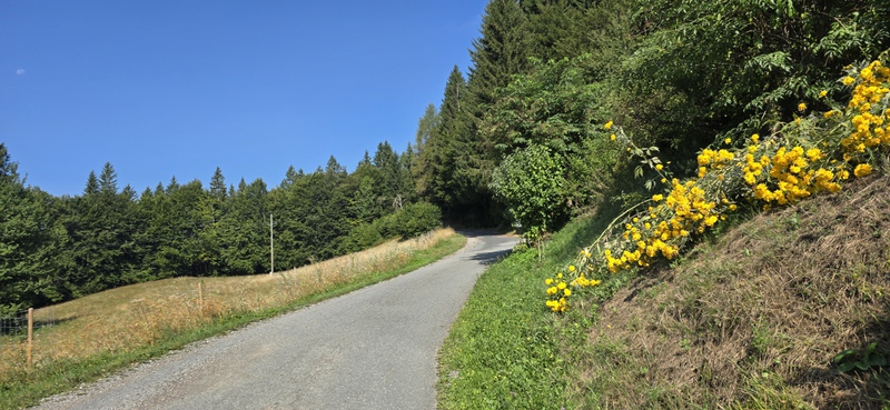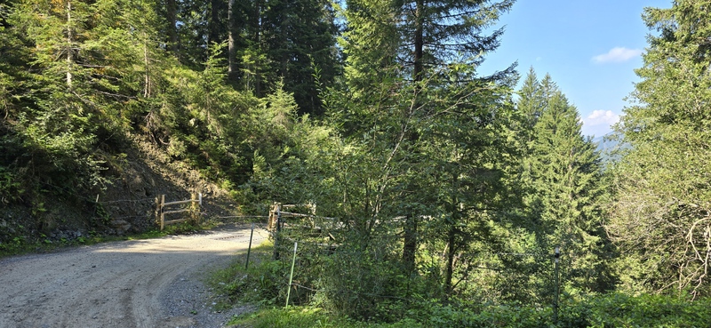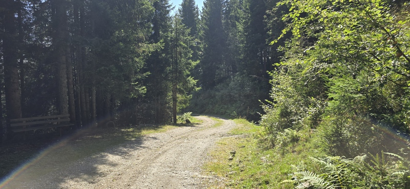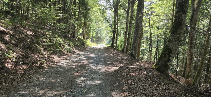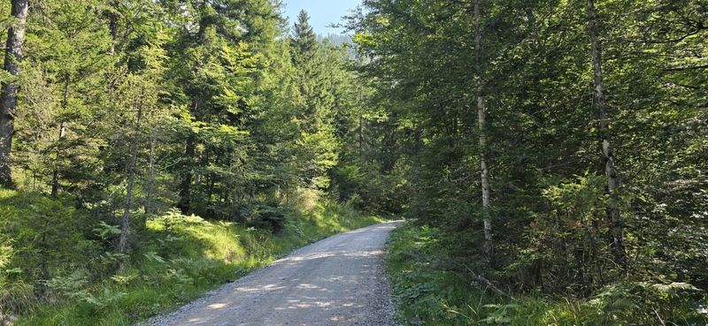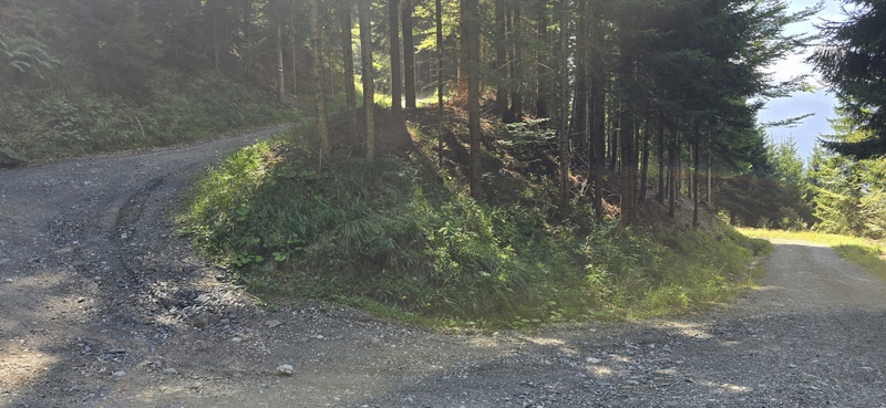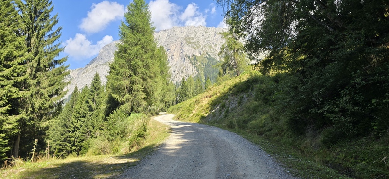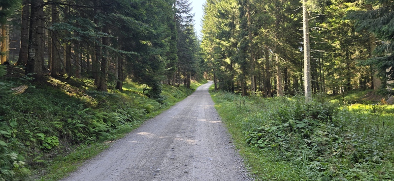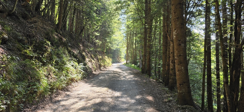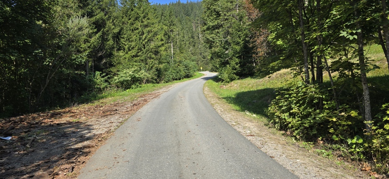 Da adesso in poi la strada diventa sterrata e notiamo pure che c'è la possibilità di parcheggiare anche qui, nel caso volessimo fare questo percorso a piedi. Per fortuna siamo in mezzo al bosco, la calura di agosto si fa sentire e l'ombra ci regala un po' di sollievo, la strada purtroppo sale con pendenza media del 10% ed è impegnativa ma il suo fondo è compatto e con ghiaia fina. Qualche passaggio si vede che è stato eseguito un rattoppo con ciottoli più grossi a causa delle piogge o della neve. Nel percorso possiamo trovare qualche strada che si dirama dalla principale, ma è sempre ben segnato il percorso e poi è semplice capire qual è basta andare sempre in salita!!