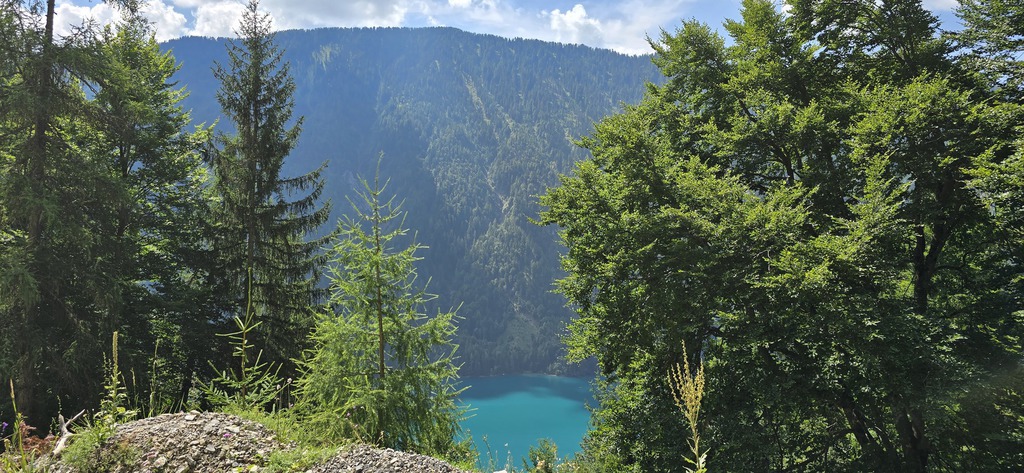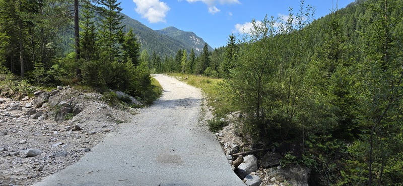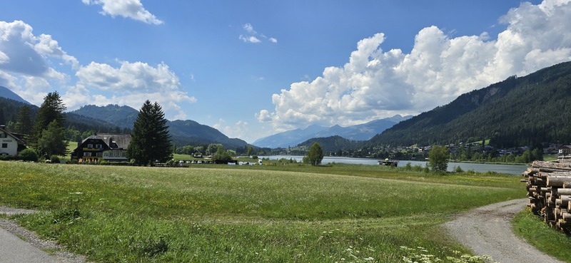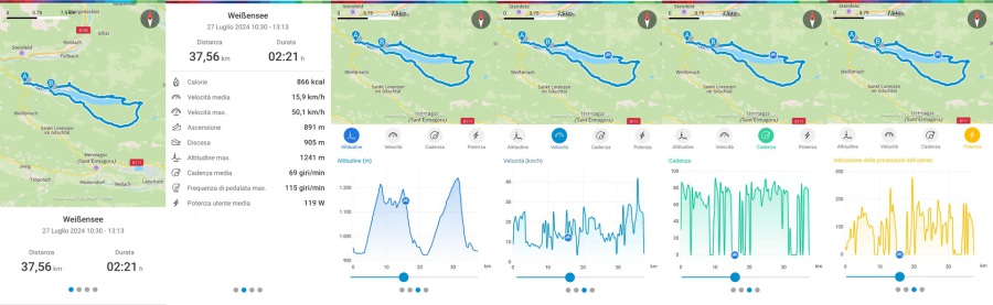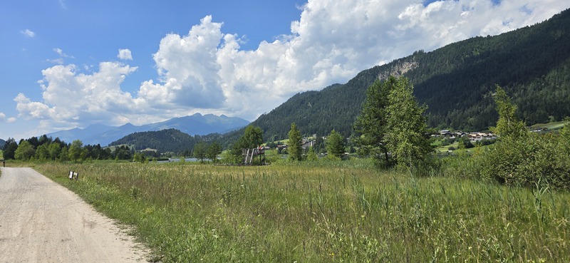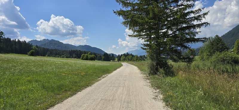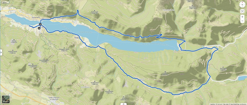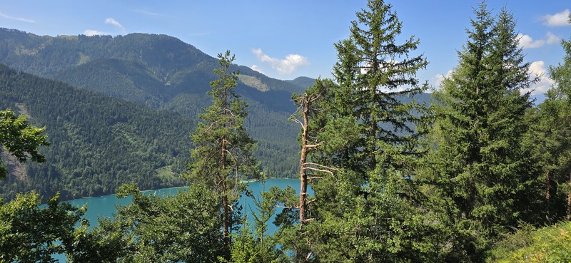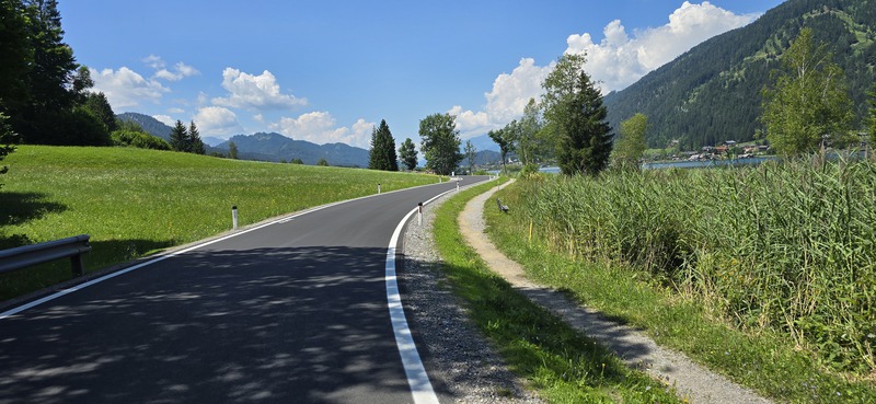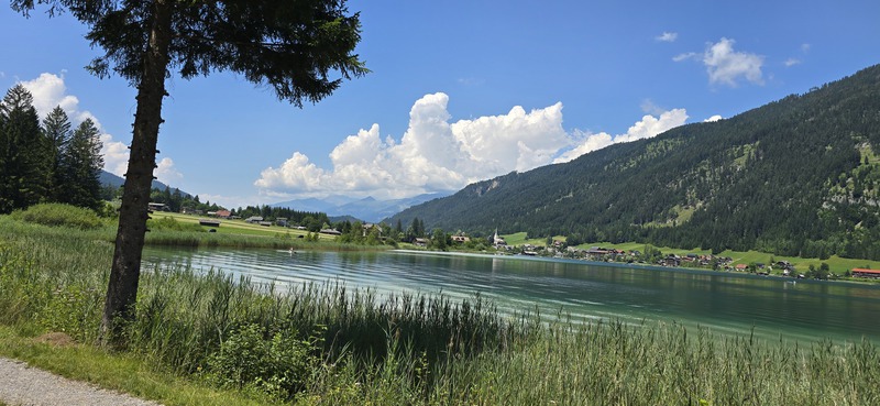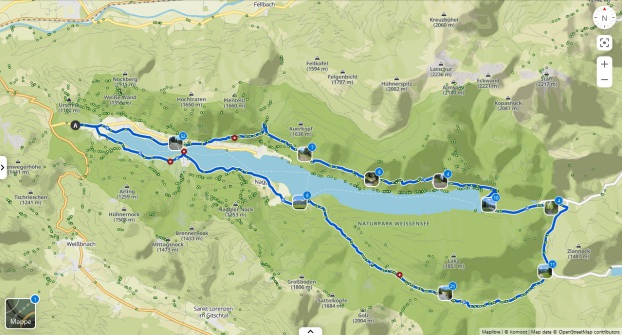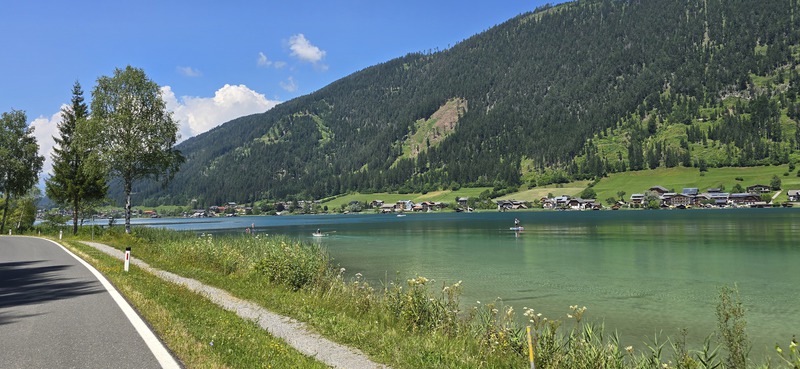 Bisogna premettere che non esiste un giro ufficiale del Lago Weiẞen (Weiẞensee), perché la riva ad est che termina con la località Ortsee (tolto per il sentiero sul lato nord) e il suo campeggio non ha una strada o un percorso che permetta di fare il lungolago. Nonostante ciò si riescono a fare delle strade che ci portano a fare un giro abbastanza soddisfacente. La prima volta che ho cercato di fare il giro completo proprio perché non esiste un lungolago avevo scelto una strada che sale subito lungo la montagna ma arrivato alla Hintern Brunn Alm poi mi aveva preso talmente tento tempo ed energie che sono sceso e tornato al parcheggio. L'ho ripensato e scelto il lungolago della zona ovest per poi salire a metà lago in quota per poter arrivare agevolmente all'Ortsee, poi il giro vien da sé. Il giro è lungo e impegnativo, sono poco meno di 40 chilometri con vari saliscendi, alcuni impegnativi. Il fondo non è sempre regolare e da "gravel", ma nonostante ciò ne ho viste che intraprendevano il percorso. Rispetto alla prima volta che l'ho fatto oggi (luglio 2024) era molto frequentato, quindi prestare molta attenzione alle altre persone. Prestare attenzione, ache, per le strade asfaltate perché sono percorse da automobili.