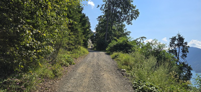 Qui inizia la salita, saranno circa 2,5km impegnativi e si salirà di circa 300mt con pendenze che arrivano anche al 16% in mezzo al bosco. Lo sterrato è abbastanza buono anche se la pioggia e i rivoli d'acqua in taluni casi ne solcano il fondo. Troveremo vari punti d'osservazione sul lago da cui si può gustare degli ottimi panorami e comprendere la bellezza di questo lago.