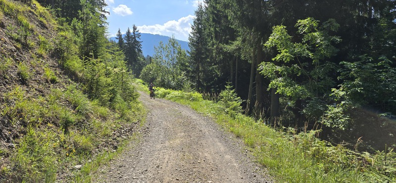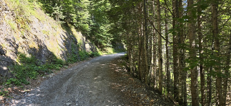 Da questo punto in poi la strada inizia a salire di nuovo per quasi 7km con pendenze medie non troppo impegnative (al 7%) anche se non mancheranno degli strappi al 10/13%, ma nulla d'insopportabile. Il panorama è decisamente bello, immerso nella natura al blu, al verde che si stagliano contro il bianco della strada sterrata, la fatica quasi non si sente visto lo spettacolo che cambia di pedalata in pedalata.