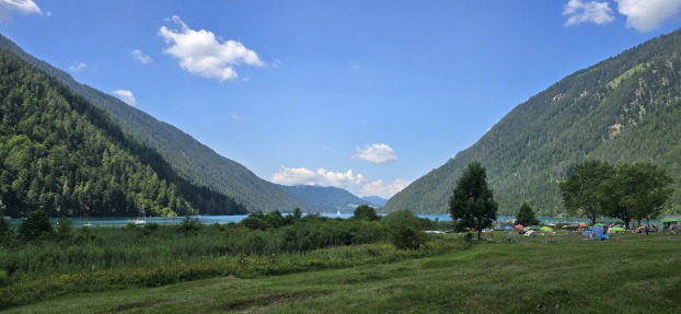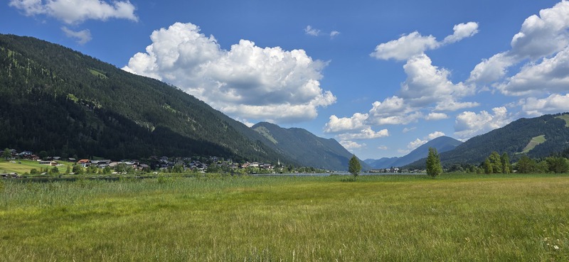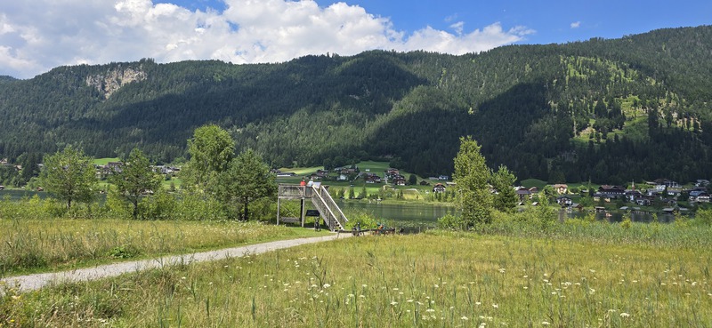 Procedendo, dopo pochi chilometri, arriviamo alla Hermagorer Bodenalm, anche qui è possibile pranzare e potrebbe essere una interessante alternativa visto che poi ci aspetta una discesa, ma ho deciso che il posto dove pranzare è a Techendorf quasi alla fine di tutto il percorso, quindi si prosegue. La discesa ci ristora, è impegnativa per la pendenza e la possibilità di trovare traffico di persone, biciclette e a volte pure automobili, ma dopo aver passato molto tempo nel bosco la strada all'improvviso spiana e ricompare davanti a noi il lago e la vista è spettacolare.