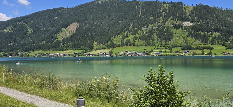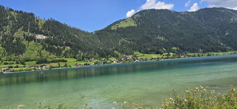 Qui la strada da sterrata ridiventa asfaltata e siamo a Naggl, percorriamo placidamente circa 4km lungolago da cui si aprono alcune spiaggette che ci invogliano a un bel tuffo nell'acqua limpida. Da qui capiamo perchè si chiama Weiẞensee (Lago Bianco), proprio per il colore che lungo la riva assume il lago, cioè bianco candido.
