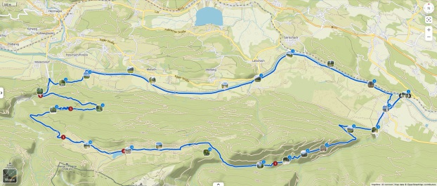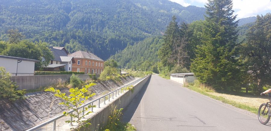 Il percorso è particolarmente impegnativo ha una pendenza media del 12% con punte di 15% e 18%, la strada è per la maggior parte asfaltata. Percorreremo la Eggeralm Landstrasse, asfaltata, per poi lasciarla e salire attraverso una valletta interna con strada sterrata, risalendo verso le Dellacher Alm. Ssolo in vista del paesino si scollina e possiamo prendere fiato, da qui accediamo alla piana con anche il lago e dalla parte opposta ci sono le Egger Alm. In tutti i villaggi c'è la possibilità di pranzare e rifocillarsi. Passate queste Alm inizia la discesa fino a Möderndorf. Intercettiamo il percorso della pista ciclabile R3 lungo fiume fino a ritornare al punto di partenza.