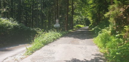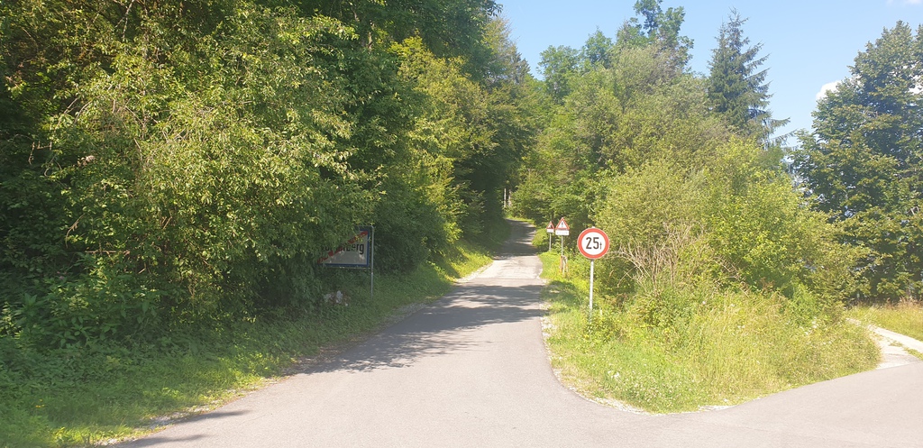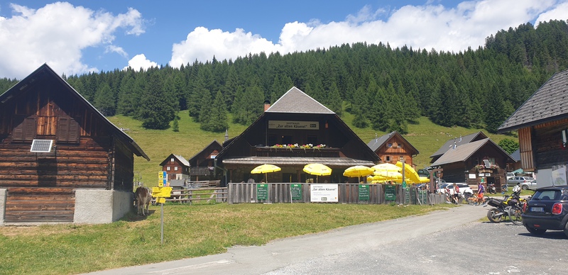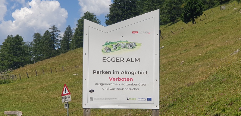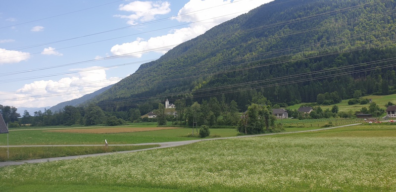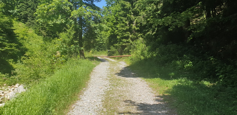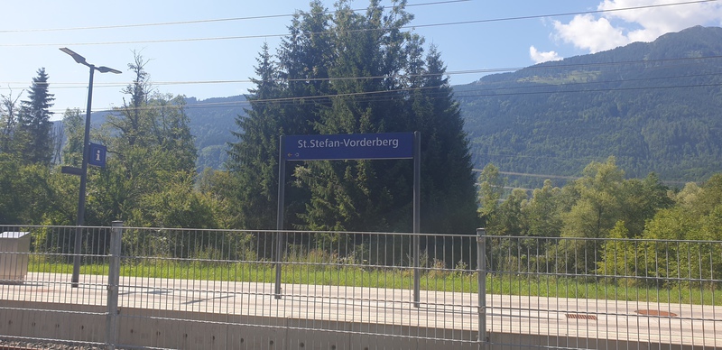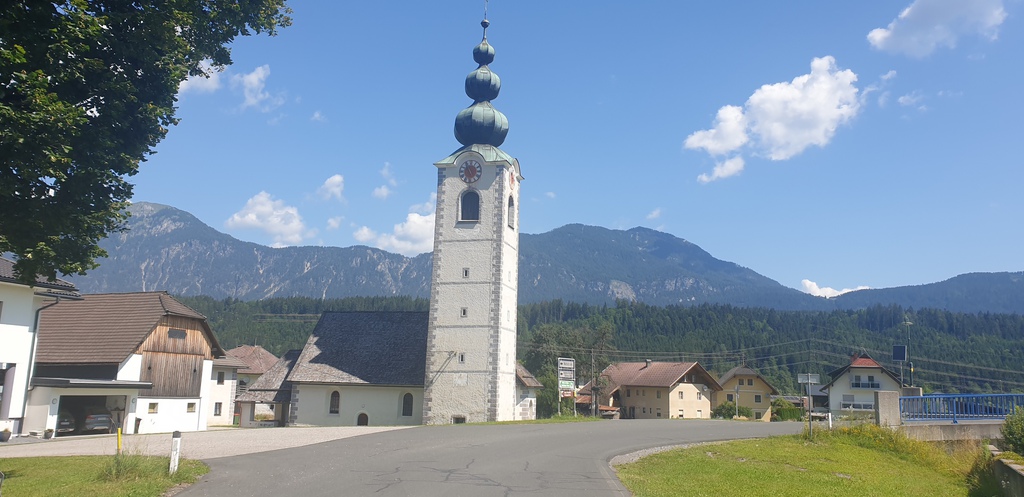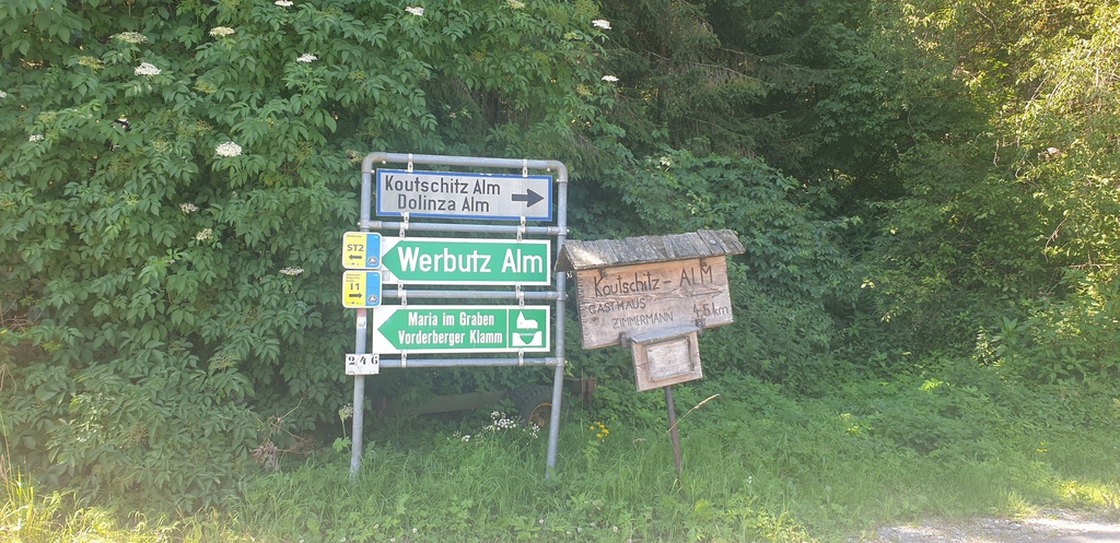 Quindi partiamo lasciando la nostra auto a Vorderberg. Questa volta ho lasciato l'auto alla stazione dei treni, ma è anche possibile farlo nel parcheggio del Naturbad all'ingresso del paese. Quindi guadagnamo il centro e passiamo il ponte stradale, giriamo a sinistra avvicinandoci alla montagna. Ai suoi piedi, poco prima della chiesa Filialkirche (Wallfahrtskirche) Maria im Graben troviamo il bivio: a sinistra la ST2 per la Werbutz Alm a destra la I1 per Dolinza Alm.