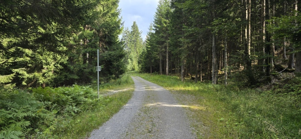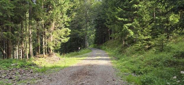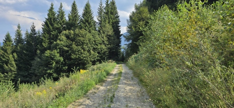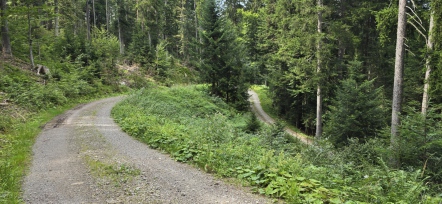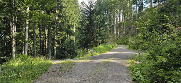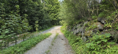 Appena fatti circa 1,5km, ecco comparire questa stradina sulla sinistra dopo i cartelli del percorso originale e l'imbocchiamo. La discesa è di circa 2km immersi nel bosco. Il fondo stradale cambia radicalmente e risulta molto sconnesso e con forti avvallamenti e non aiuta la forte pendenza che n alcuni casi arriva anche al 16%, prestiamo attenzione.