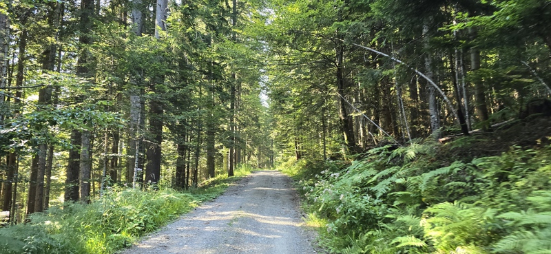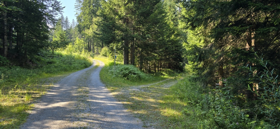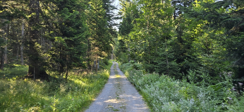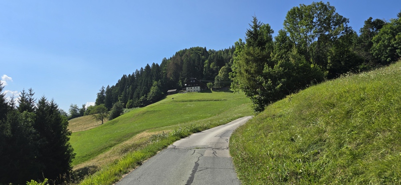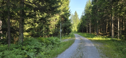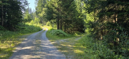 Scendiamo per un chilometro immersi nel bosco. Ad un certo punto vediamo sulla destra dei cartelli in legno che ci avvertono che a breve incontreremo una zona di rispetto naturalistica. E infatti la strada poco dopo s'interrompe. Poco prima c'è un sentierello in mezzo al bosco che ci posta a raccordarci con una strada poco più in basso (10-20mt). Da qui seguiranno 100mt in discesa con pendenza al 17% e fondo particolarmente sconnesso e solcato dai rivoli della pioggia, prestiamo attenzione. Poi dopo il tornante la strada prosegue sterrata e selvaggia per poco meno di 3km fino a incorciare la statale per il Gailberg Sattel. Giriamo a destra e brevemente arriviamo a Laas. Quindi percorriamo parallelamente alla statale una strada sterrata che poi finisce in un sentiero in mezzo al campo. Tagliamo ancora la statale e imbocchiamo una stradina di Kötschach, che poi confluisce nella strada principale del paese che ci porterà, dopo aver optrepassato il Duomo al centro della cittadina, di nuovo al parcheggio nei pressi del Municipio.