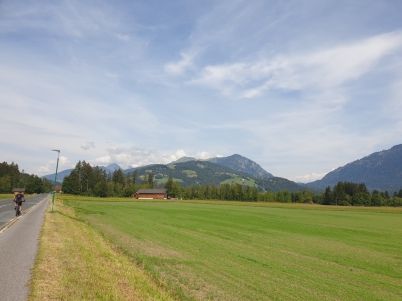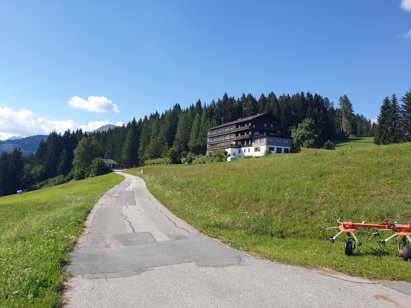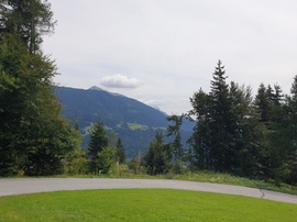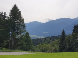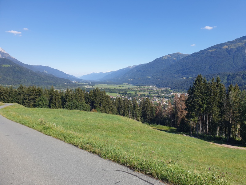 Dopo i primi 6 tornanti ci troviamo già ad una buona altitudine presso i masi della frazione Kienze (salita del 10/11%). Fino a Vorhegg la strada sarà asfaltata e dovremo prestare attenzione alle auto ma anche ai trattori essendo zona agricola. Dopo altri 7 tornanti e dopo aver percorso poco più di 4 km siamo a Vorhegg e abbiamo due belle visuali: una sulla valle del Gail e la seconda sulla valle Lesach. Nei pressi dell'albergo chiuso quasi alla fine della strada asfaltata in piena curva parte la nostra strada sterrata in mezzo al bosco. E' sempre ben segnata dai cartelli che indicano il percorso ciclabile KM3 e anche se troviamo la sbarra è agevolmente bypassabile a sinistra senza smontare dalla bici. Adesso siamo in mezzo al bosco.
