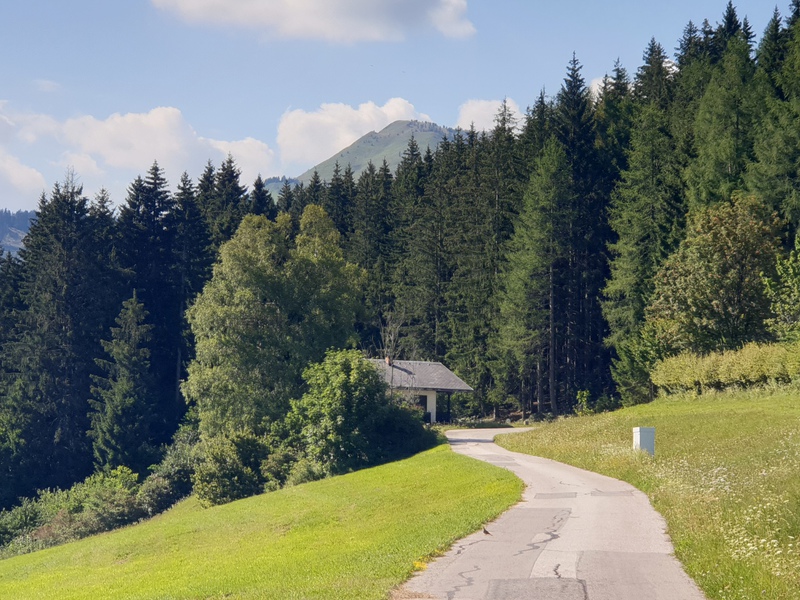 Vista da lontano la foto qui a fianco ci fa capire a grandi linee il giro che faremo e cioè saliremo su questa collina, anche se la cima sarà in mezzo al bosco, ogni tanto avremo qualche bel panorama. Partiamo dal parcheggio e imbocchiamo la statale sulla destra che porta nella valle della Lesach (Lesachtal). Dopo circa 500mt al primo ruscello svoltiamo sulla destra e iniziamo la nostra salita tenendoci sulla sinistra e inerpicandoci con un 7/8% di pendenza sul lato sinistro della collina.