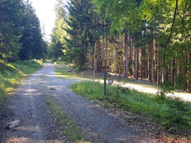 Torniamo indietro per circa 1,5km e al bivio ben segnalato prendiamo la strada che scende sulla sinistra. Percorriamo in discesa sulla strada forestale per 1,8km e