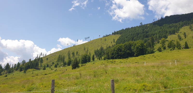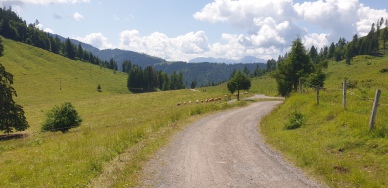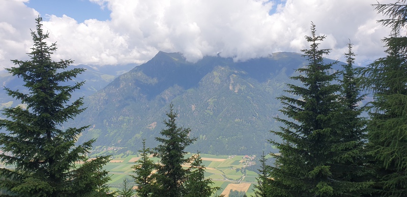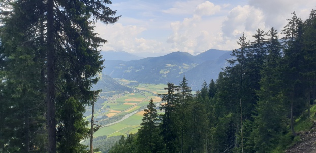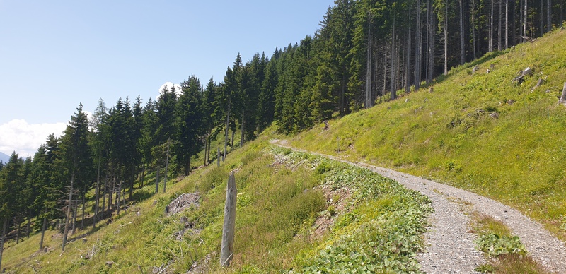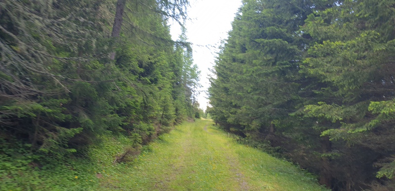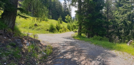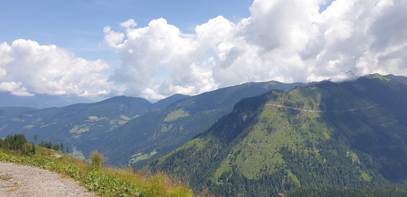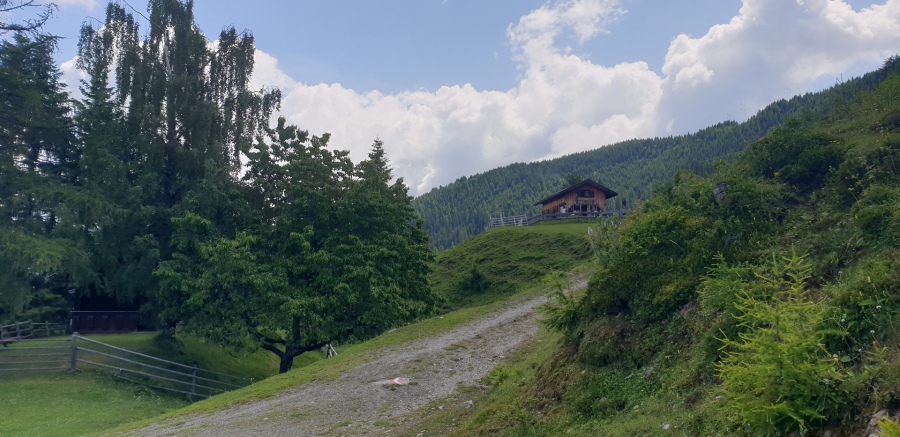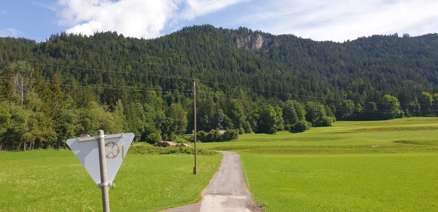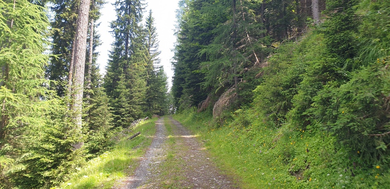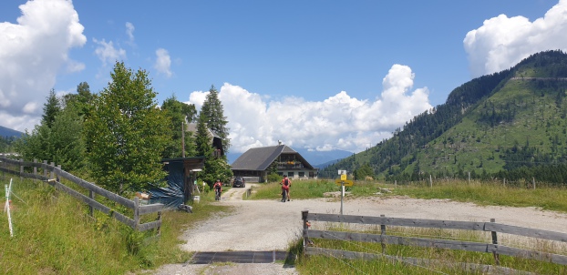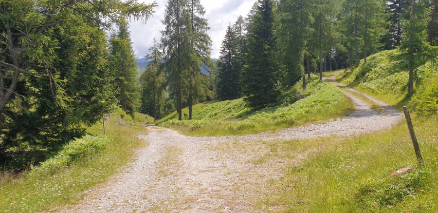 Arriviamo velocemente e agevolmente alla Gaiacher Alm dove è possibile fermarsi e, oltre ad ammirare il panorama, anche mangiare. La strada ridiventa forestale a grana fine, con qualche tratto di fanghiglia, soprattutto se il giorno prima ha piovuto. Prima di scollinare e scendere definitivamente dopo circa 14km e circa due ore si presenta un bivio.