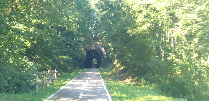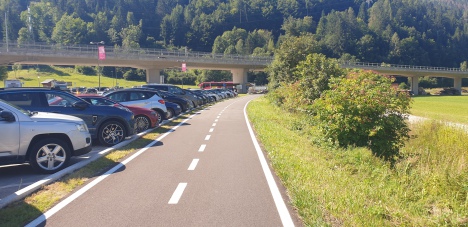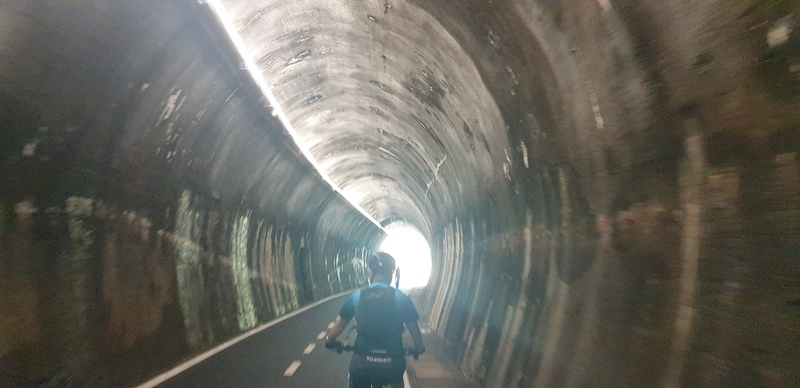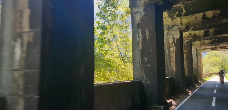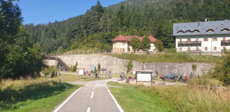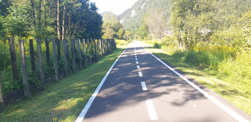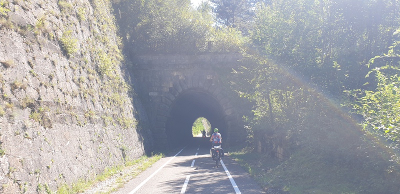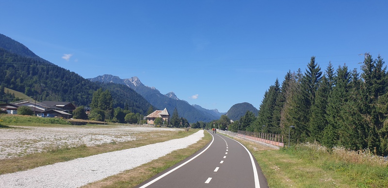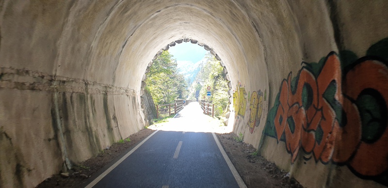 Passati dall'altra sponda, si arriva brevemente al bivio, a sinistra si va verso Tarvisio, a destra verso l'Austria. La striscia d'asfalto della grandezza dei binari della vecchia ferrovia rendono più piacevole la pedalata. La pista sin dalle prime pedalate è molto frequantata non solo da persone e gruppi in bicicletta ma anche da molti pedoni che passeggiano. La giornata assolata favorisce lo stare all'aria aperta. Qualche consiglio facciamo attenzione perchè le gallerie, e ce ne sono parecchie, l'aria è piuttosto umida e quindi nelle giornate estive si potrebbe rischiare di effettuare svariati sbalzi di temperatura. Il percorso è semplice, in fondo basta seguire la striscia d'asfalto, è sostanzialmente tutta dritta senza grossi cambi di destinazione, sempre molto ben segnalata e in sede propria.