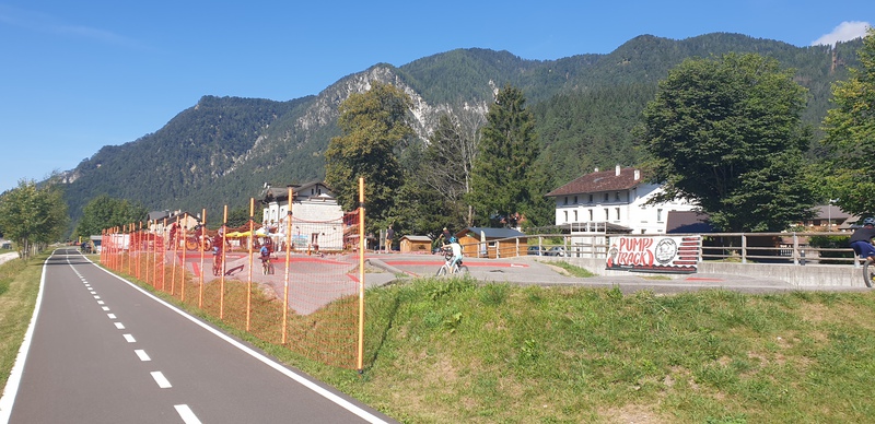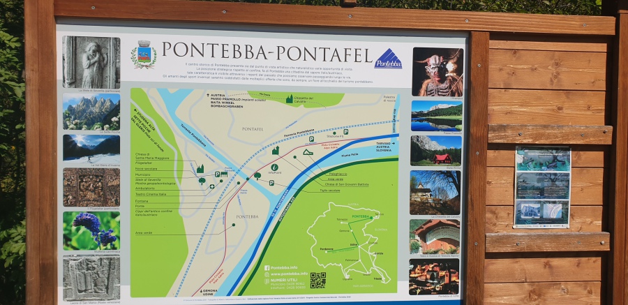 Passata Ugovizza, costeggiamo Malborghetto e dopo varie curve e passato un ponticello di nuova costruzione, anche Bagni di Lusnizza. La giornata è piacevole e il sole ci ragala il meglio dei paesaggi e del panorama. Poche pedalate e dopo essere passati sotto lo svintolo autostradale per l'uscita di Pontebba arriviamo nel cuore della cittadina. Passare sotto il viadotto autostradale non è piacevole, ma poi Pontebba ci regala molta vitalità.